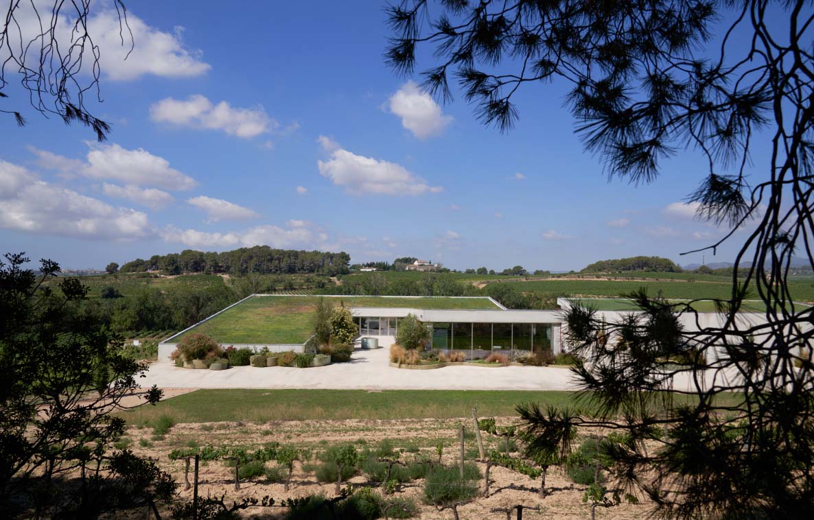 Mas Muntanyans vingården, hvor Cava’en laves, ligger i hjertet af Penedès’ vinmarker Den blev indviet i 2019 og er bygget fuldt bæredygtigt, perfekt integreret i landskabet og designet til at respektere miljøet og områdets biodiversitet.